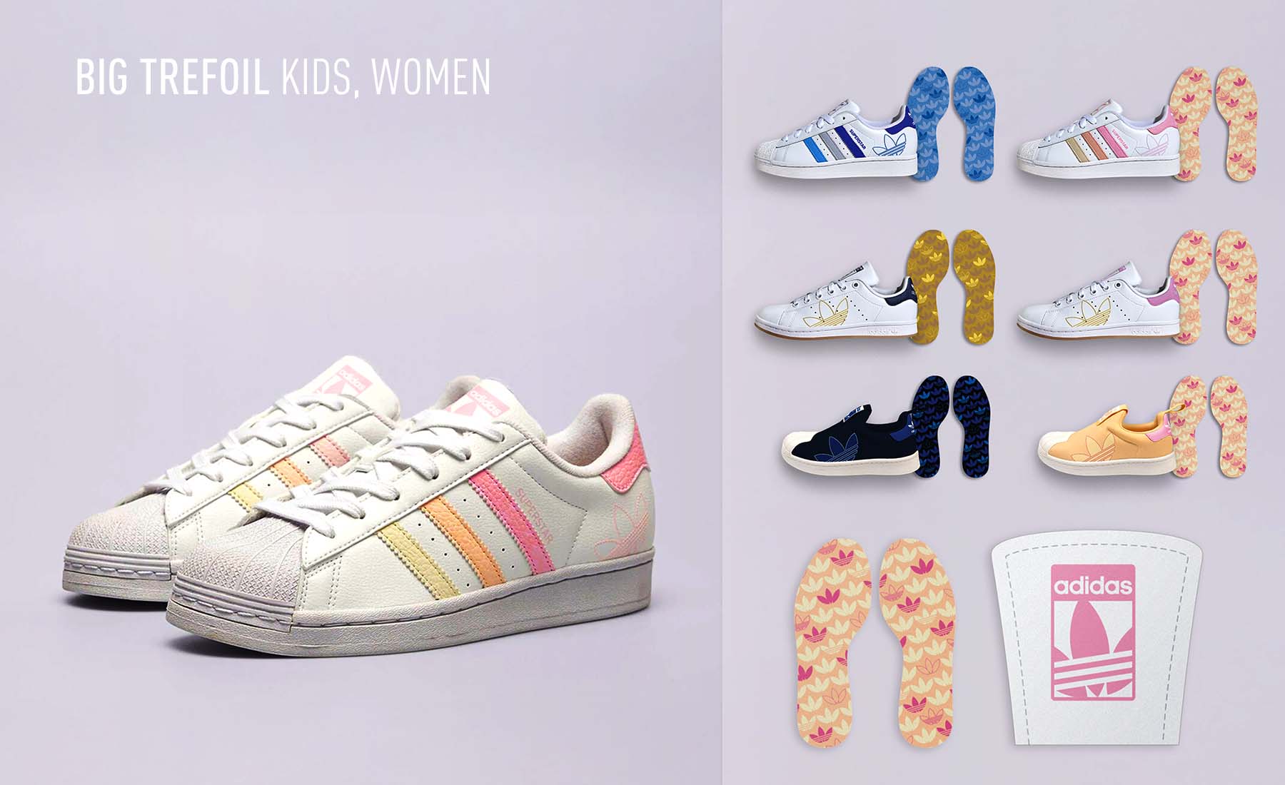 For this summer 2024 sneaker pack, I created a bold branding concept across multiple franchises, centered on an oversized Trefoil graphic. The design features a 3D-printed Trefoil on the upper, crafted with fine linear detailing that evokes the look of stitching. The concept is extended through playful variations of the Trefoil on the tongue label and sockliner, exploring different scales and placements.