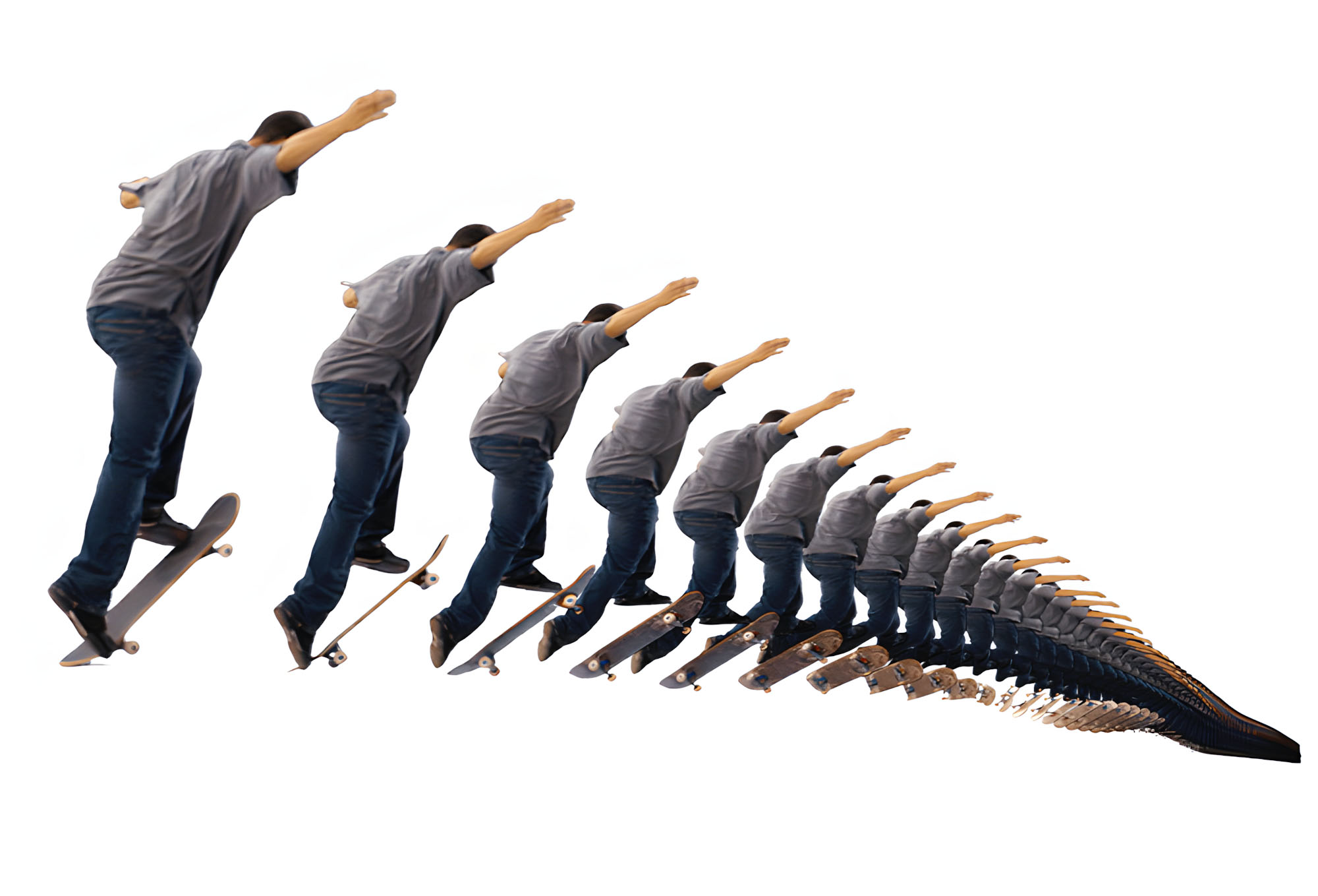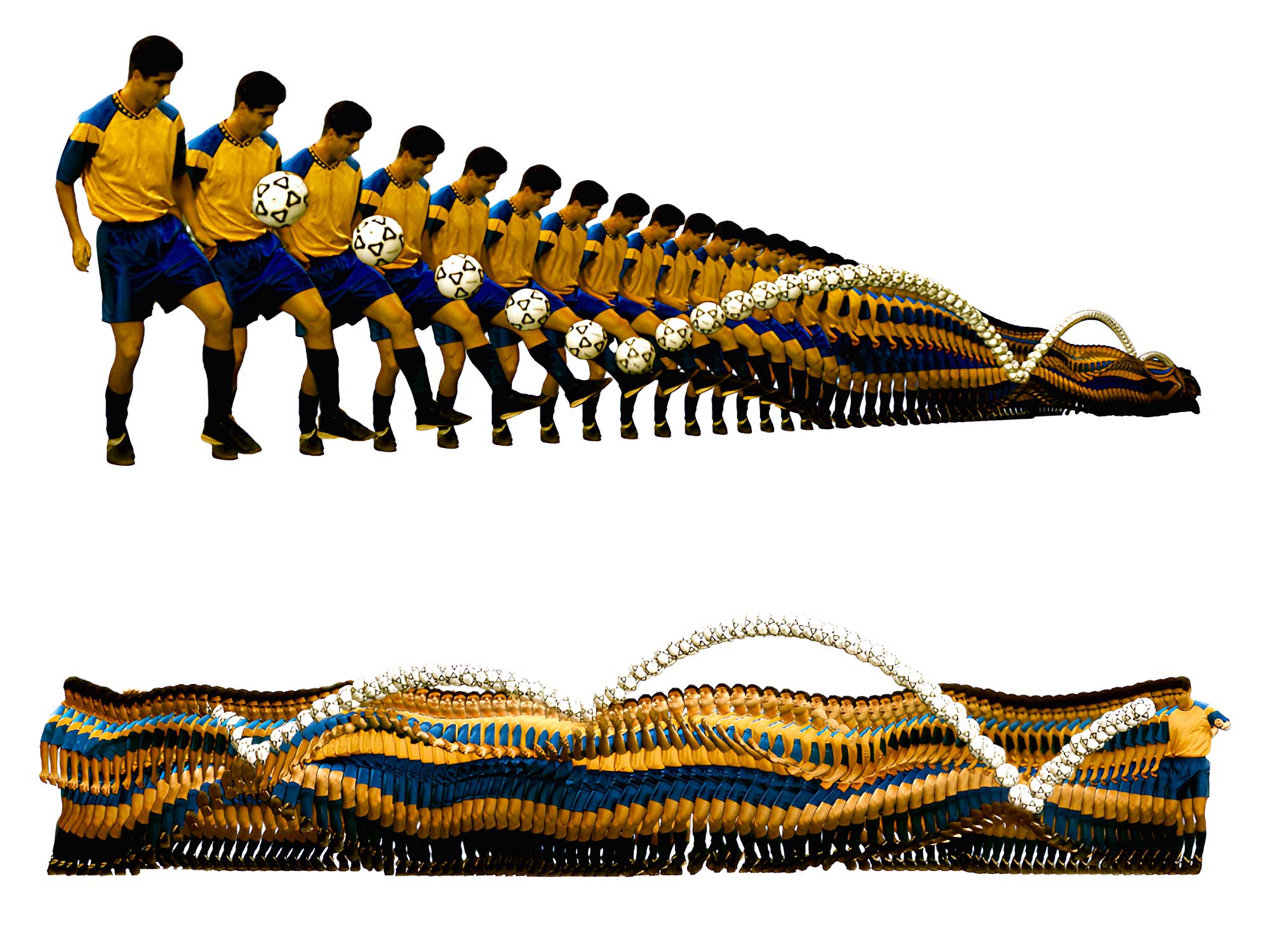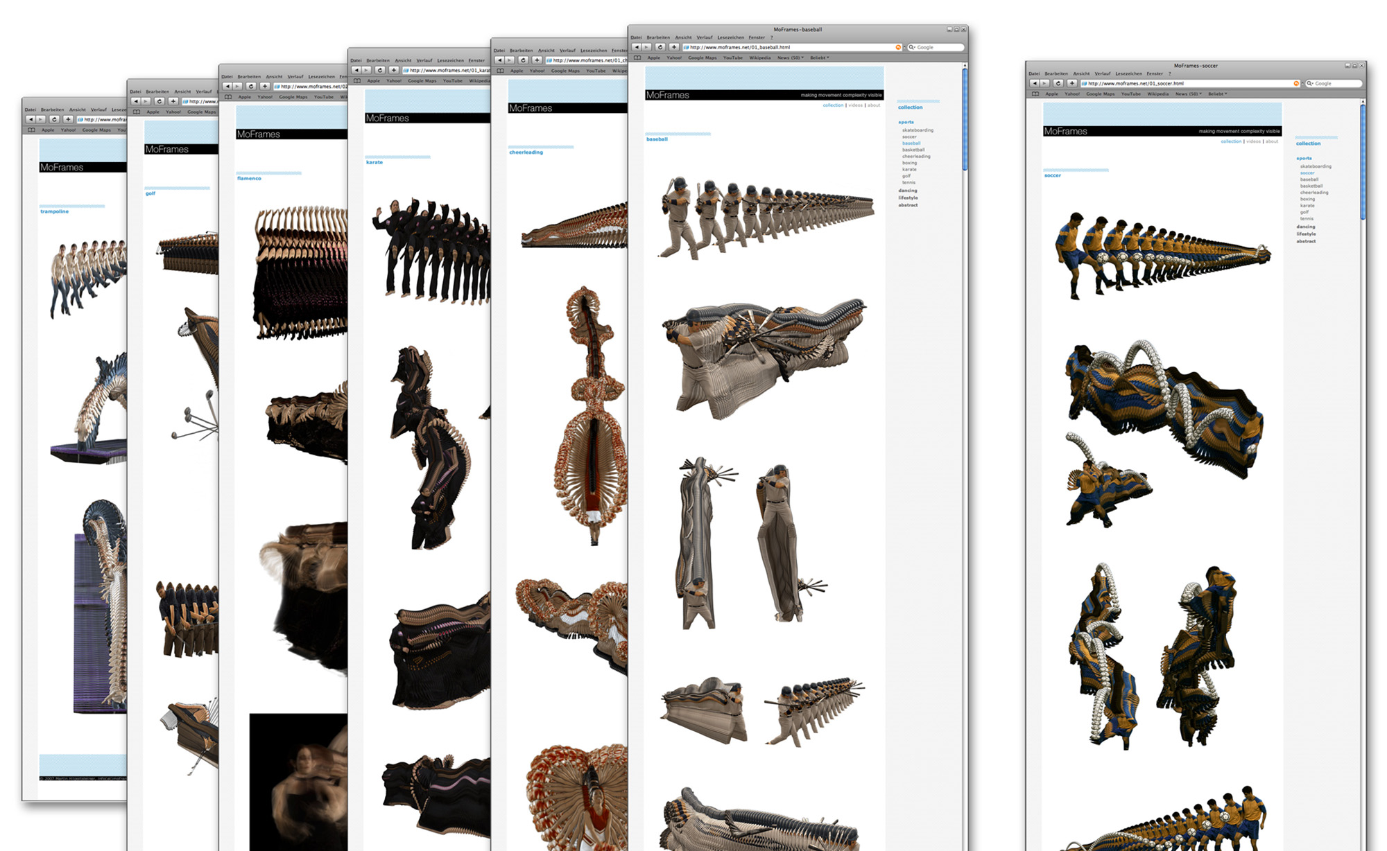 Moframes – making movement complexity visible – is a compact online archive dedicated to the study of sports motion. Its visualizations build on techniques from my Recreating Movement project – a tool that extracts individual frames from a film sequence and arranges them sequentially in three-dimensional space. This spatial representation of time reveals intricate patterns and offers unique insights into the complexity of human movement. moframes.net is currently offline.