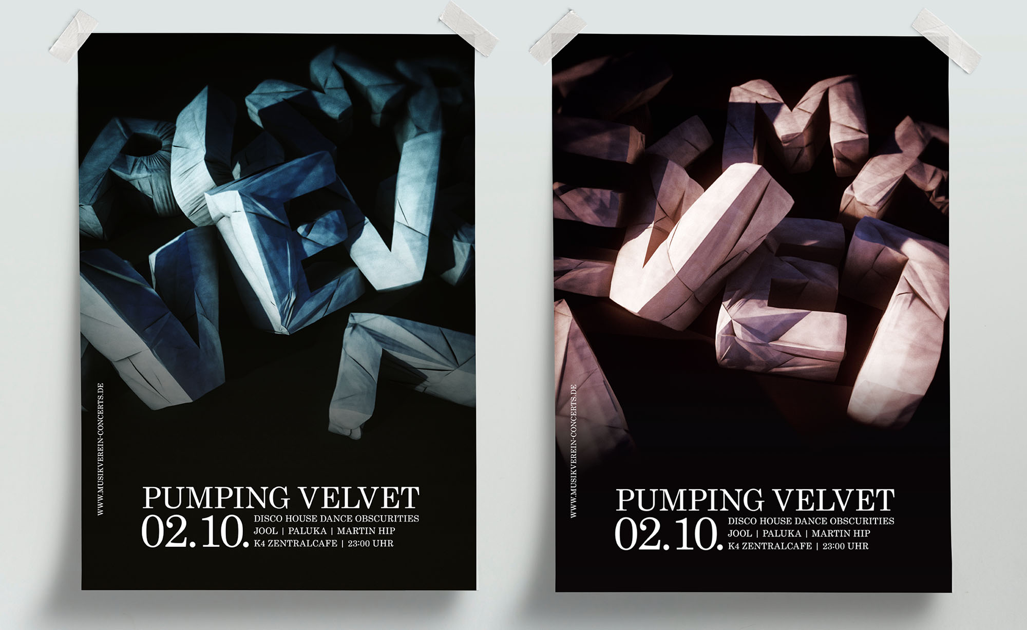 For the Pumping Velvet club night, a house music party in Nuremberg, I created posters and flyers featuring 3D renderings of the event title as folded, paper-like letters, creating a strong and recognizable presence for the event.