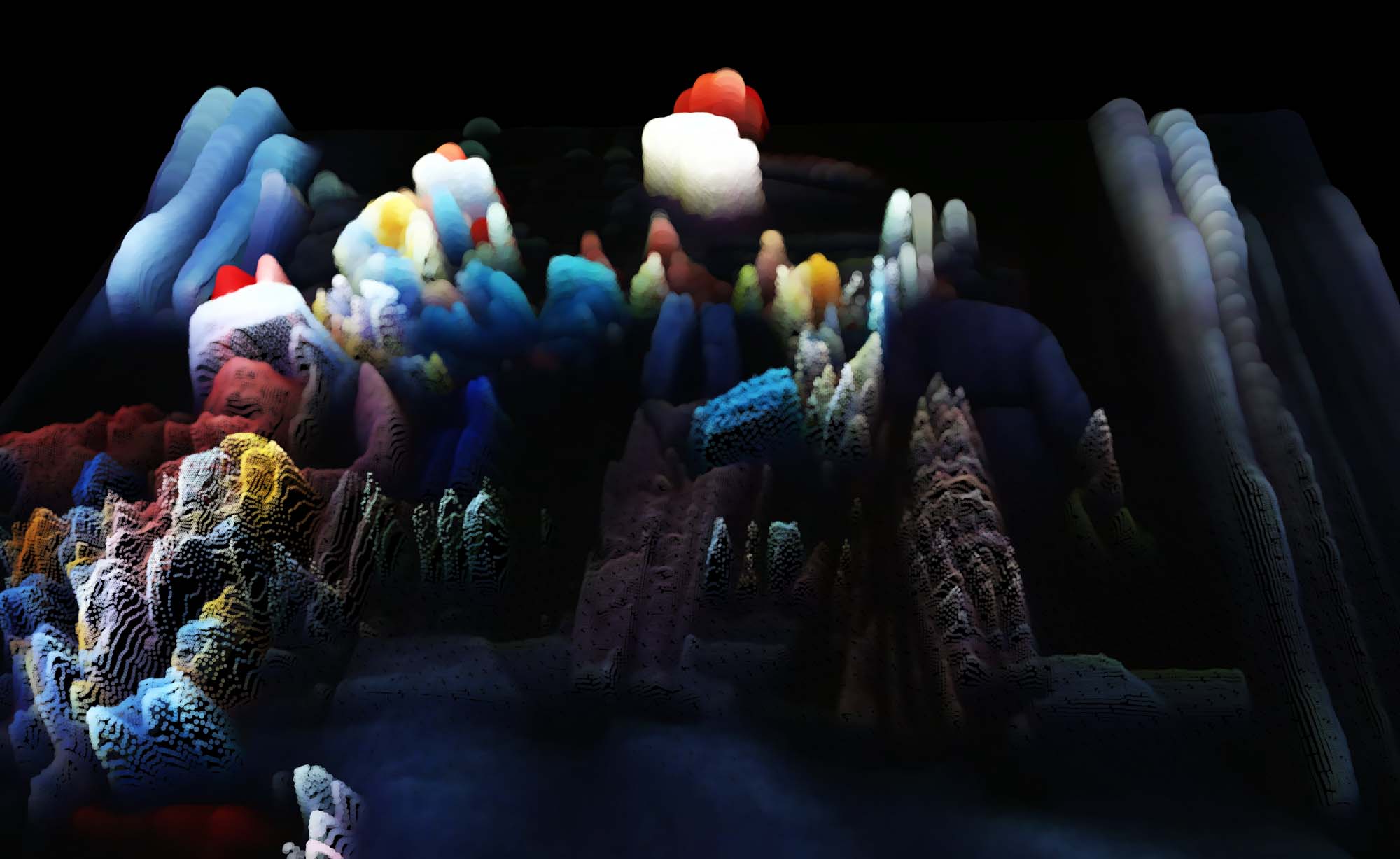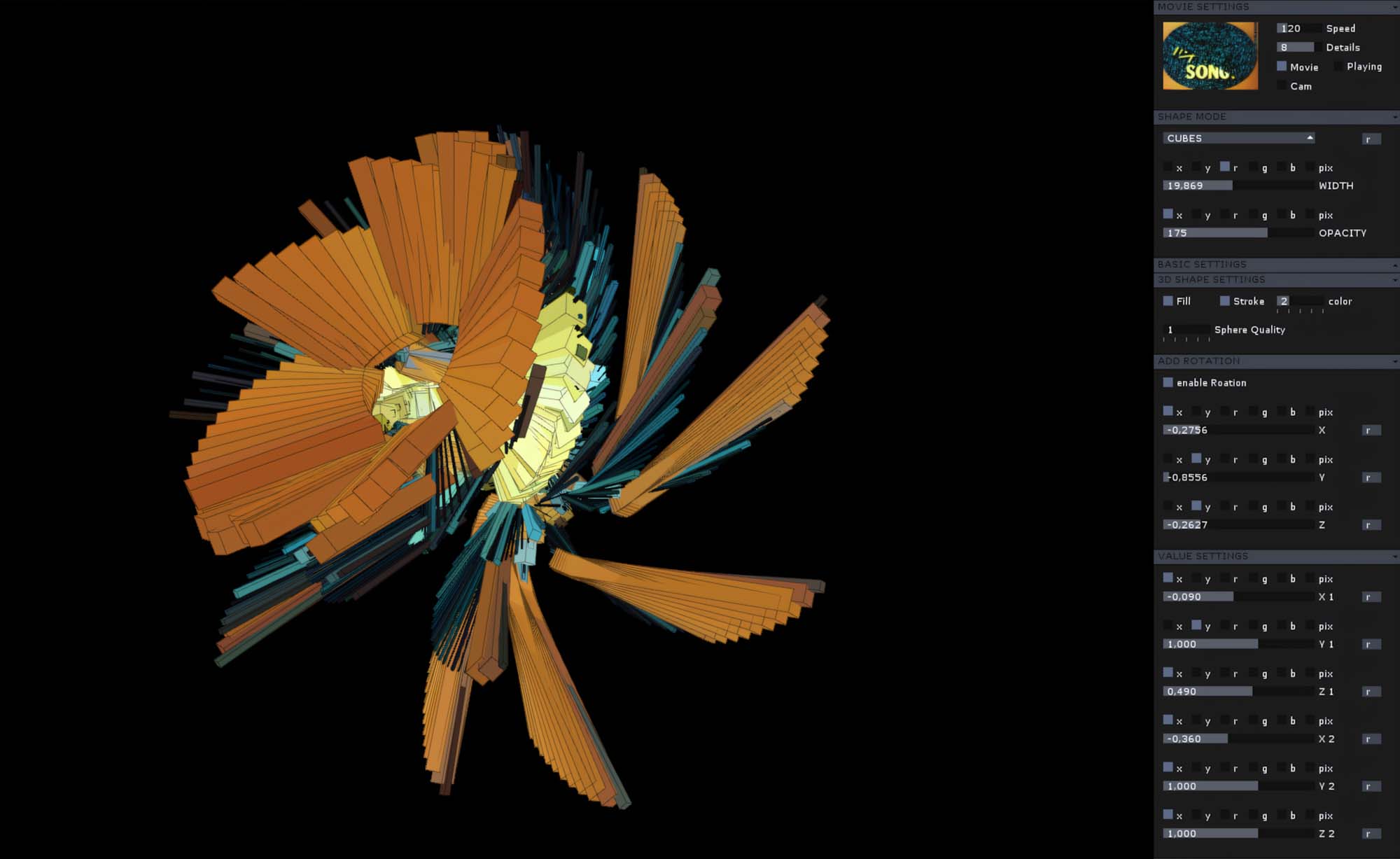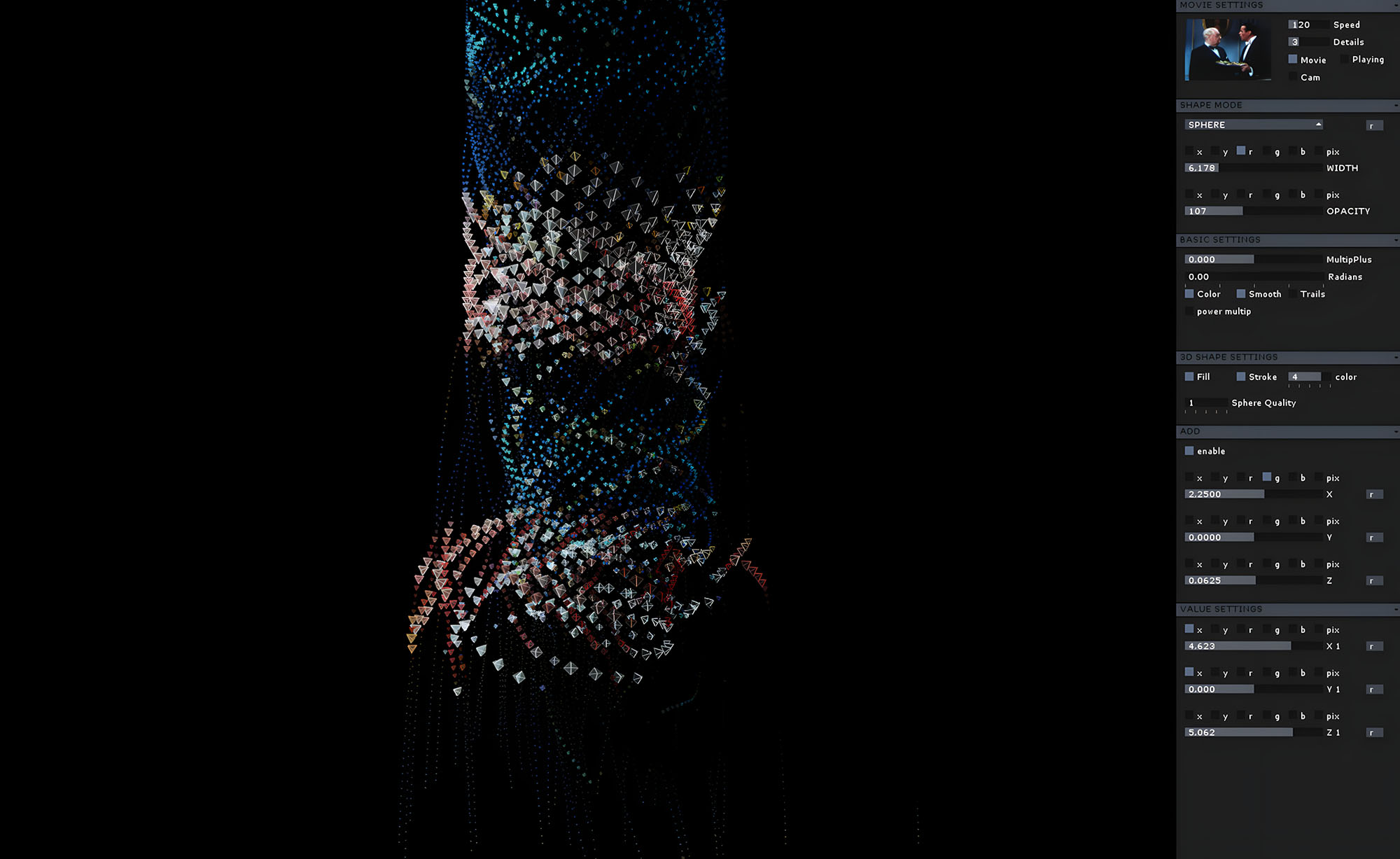 Too Many Points is an experimental video tool that transforms pixel data from film sequences or live webcam input into immersive three-dimensional worlds in real time. It measures the color values of every pixel, then rearranges them in a virtual 3D space, where users can manipulate the image with filters, parameters, and shape modes – creating dynamic, abstract visuals to explore and zoom into. This makes it a unique fusion of video processing, generative design, and interactive 3D visualization – a playground for artists, designers, and anyone fascinated by the hidden patterns of moving images. The tool supports vector export, enabling generative visuals to be transformed into scalable, high-resolution artworks